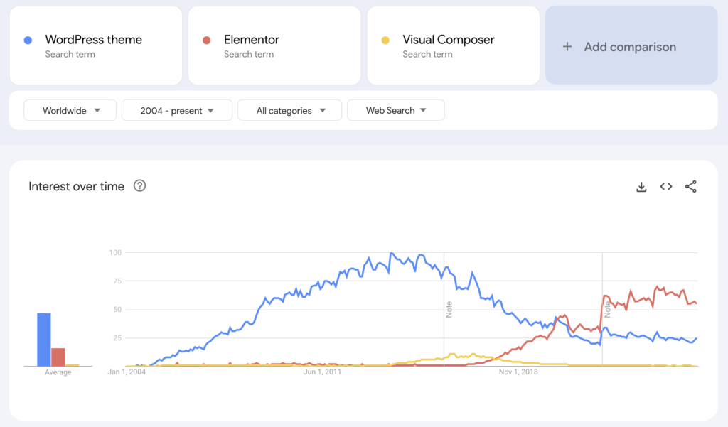 Elementor came out on top, used on almost 30 percent of all the sites we scanned. That didn’t surprise me. What did catch my attention is that WPBakery is still the second most used page builder. If you look at the Google Trends image above, WPBakery (or Visual Composer) was never really popular as a search term. Still, their plugin ended up on a lot of sites because it was bundled with many well-known themes. This gave WPBakery a huge user base even though it wasn’t always in the spotlight. Divi continues to hold a solid place as well.
